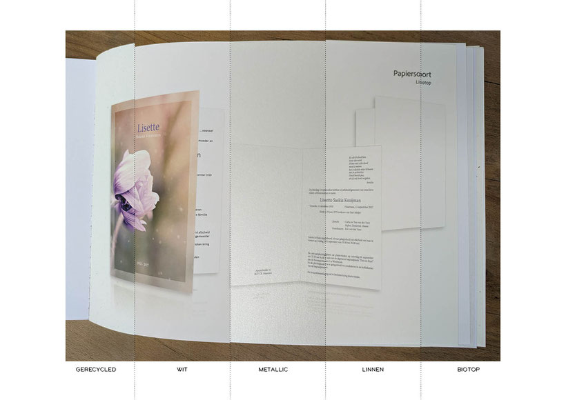 papiersoorten, waarvan Biotop papier de meest populaire keuze is dankzij zijn crèmekleurige uitstraling. Daarnaast bieden we ook wit, linnen, metallic en gerecycled papier aan.